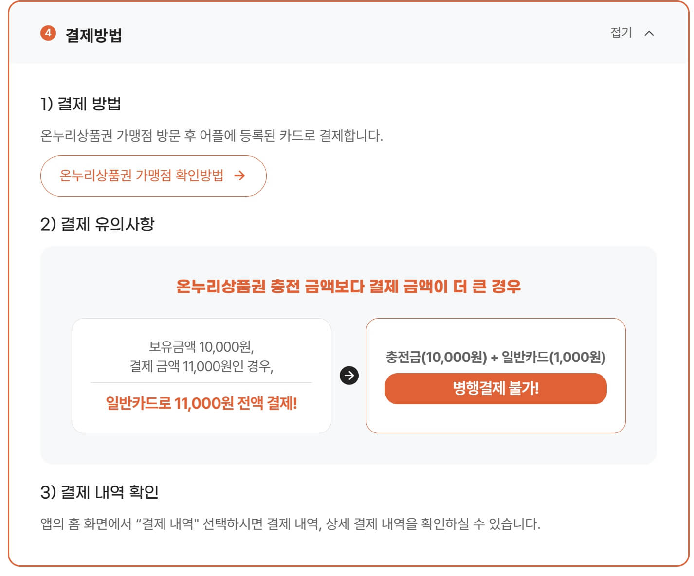 - 결제 금액 > 충전 금액 시, 병행 결제 불가 → 일반 카드로 전액 결제됨