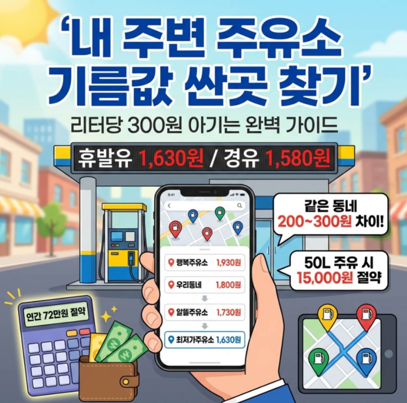 같은 동네에서도 주유소마다 리터당 200~300원 차이가 나는 현실. 50리터 주유 시 15,000원, 월 4회 주유하면 연간 72만원의 차이가 발생합니다. 이 글에서는 스마트폰 하나로 1분 만에 최저가를 찾고, 추가 할인까지 받는 확실한 방법을 알려드립니다.