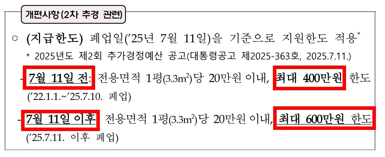- 2025년 7월 11일 이후 폐업: 최대 600만원