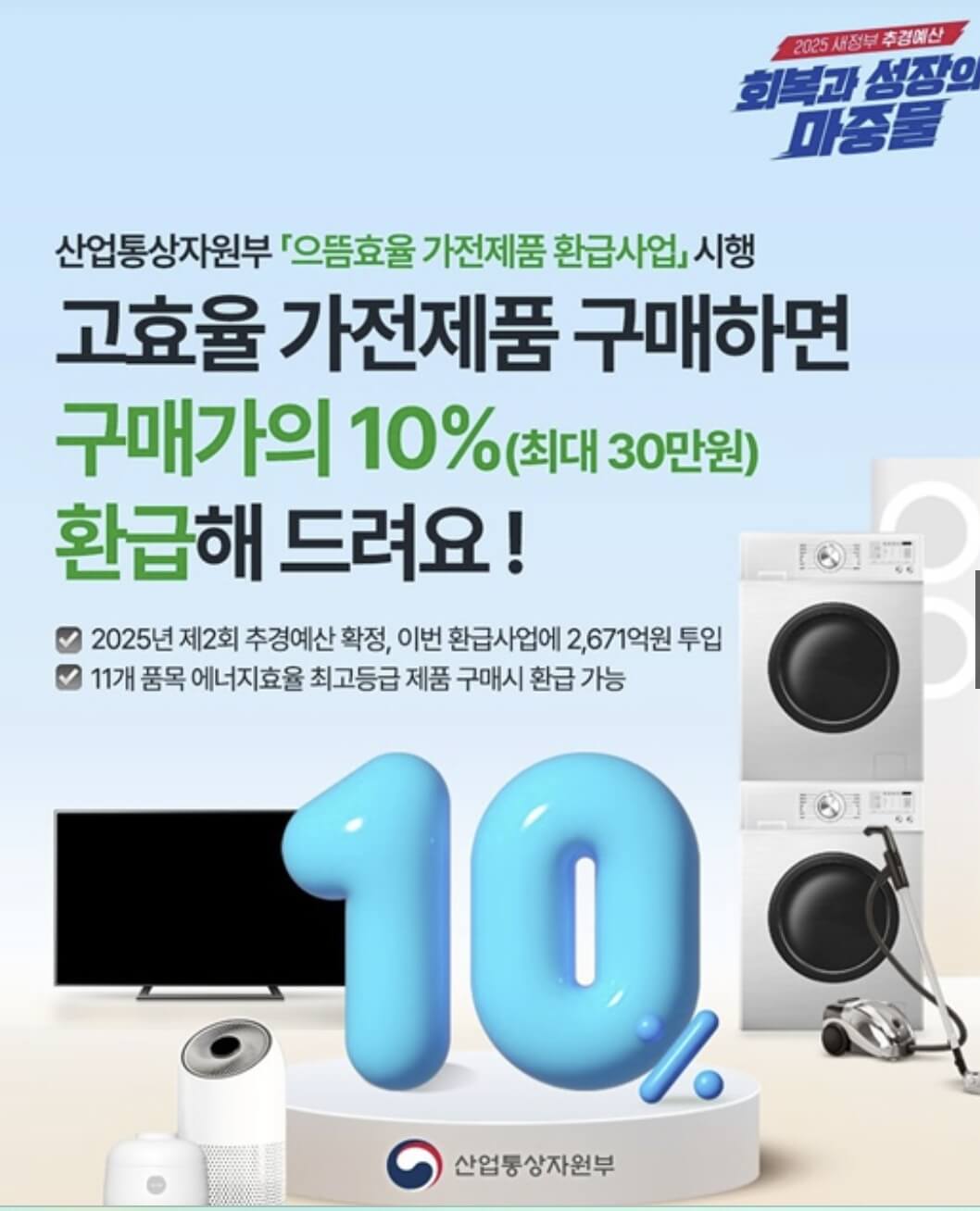 냉장고, 에어컨, TV 등 1등급 에너지 고효율 가전제품을 구매하면 최대 30만 원까지 환급받을 수 있는 절호의 기회입니다.